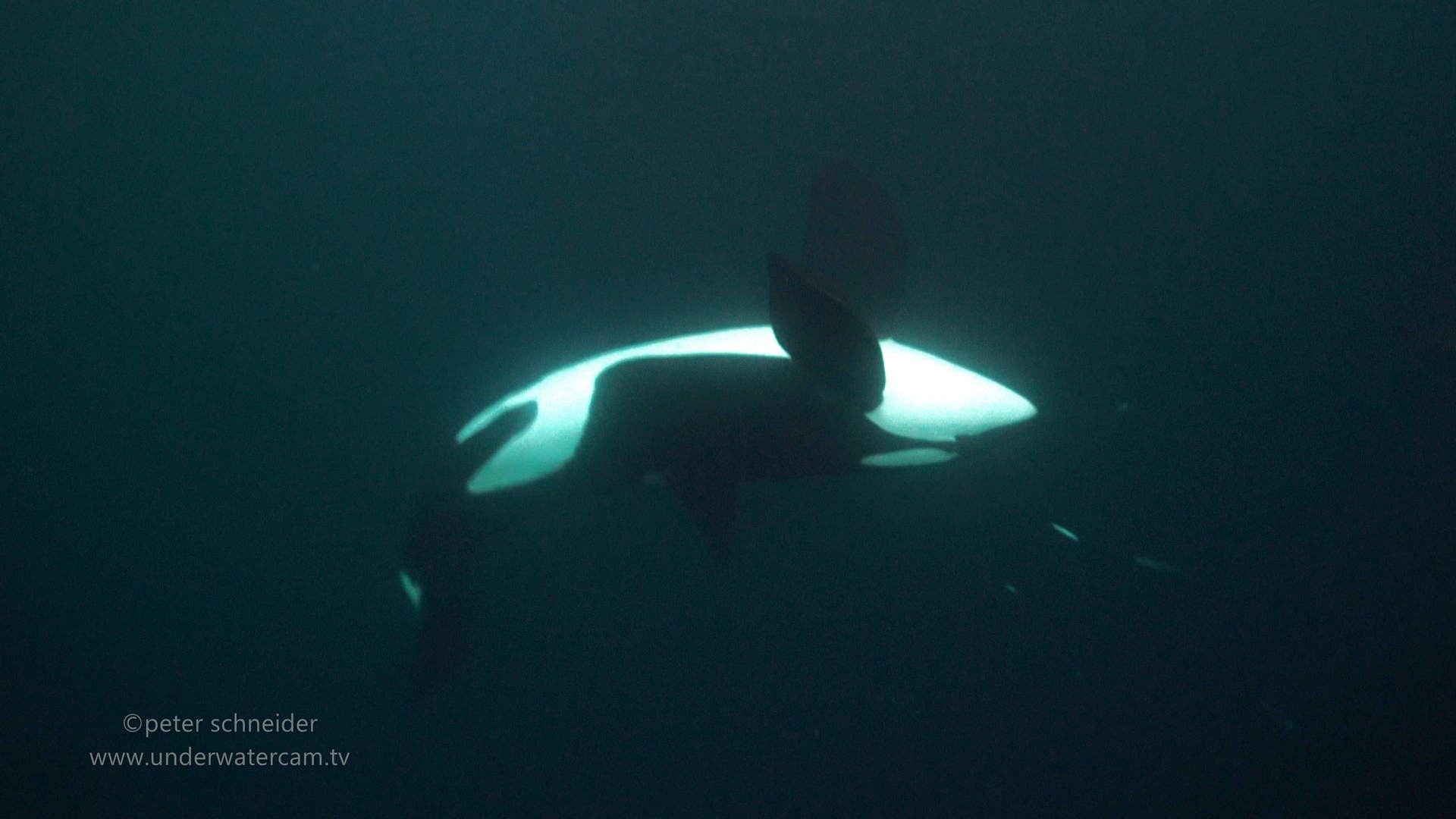 Ein undurchdringlich erscheinenden Vorhang von Heringen öffnete sich unter uns und gab die Bühne für die Orcas frei. Natürlich nicht aus Freundlichkeit, sondern aus reinem Überlebenswillen teilte sich der Heringsvorhang. Orcas waren jetzt rechts, links, vor und unter uns. Manchmal schienen die Wale einfach nur friedlich durch den Schwarm von Heringen zu schwimmen. Im nächsten Augenblick stürzten sie sich dann kopfüber hinein in den Schwarm , bremsten mit den Brustflossen ab, brachten die Fluke nach vorn, um dann in einer Rückwärtsrolle mit der Fluke in den Heringsschwarm zu schlagen. Anschliessend wurden die benommenen und verletzten Heringe, einer nach dem anderen, aus dem Wasser gepflückt.