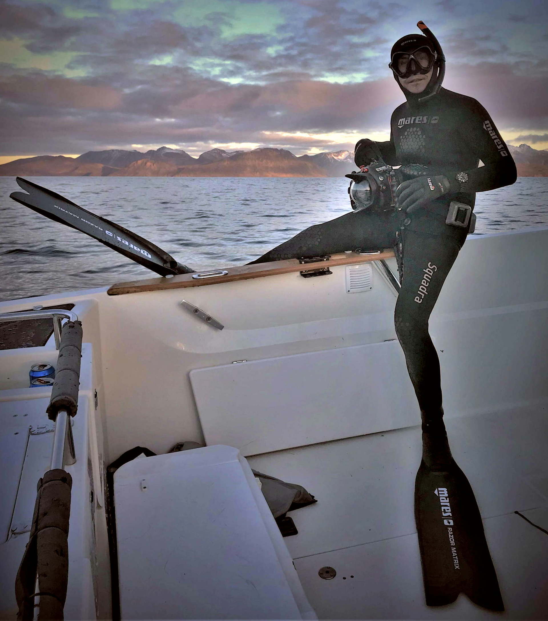 Ein Bein über der Bordwand hängend, die Kamera auf dem Schoss, warteten wir auf das Zeichen von unserem Guide und Skipper Emanuel. Als das „GO“ kam glitt ich ins kalte, dunkle Wasser. Kalt? Überraschender Weise blieb ein Schock und sogar ein unangenehmer Schauer völlig aus. Ich hatte das Gefühl, dass ich nicht einmal nass wurde in meinem Squadra 7mm Nasstauchanzug.